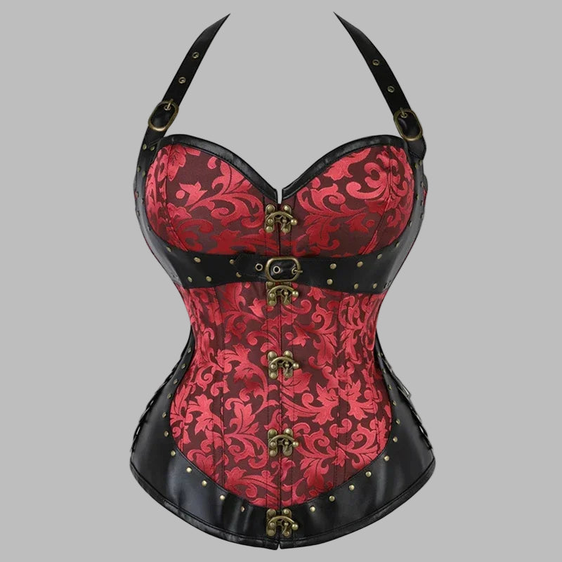 Punainen brokaattinen steampunk-korsetti mustilla nahkayksityiskohdilla ja soljilla