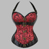 Steampunk-punainen brokaattikorsetti mustilla nahkayksityiskohdilla ja soljilla, koko XXL