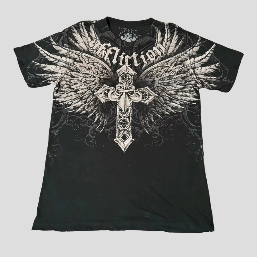 Punk rock -T-paita siivillä ja ristillä, grunge-tyyli