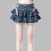 Punk rock -tyylinen farkkuminihame röyhelöillä ja vaaleanpunaisilla nauhoilla