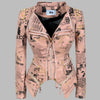 Punk rock -tyylinen vaaleanpunainen biker-takki sanomalehtiprintillä