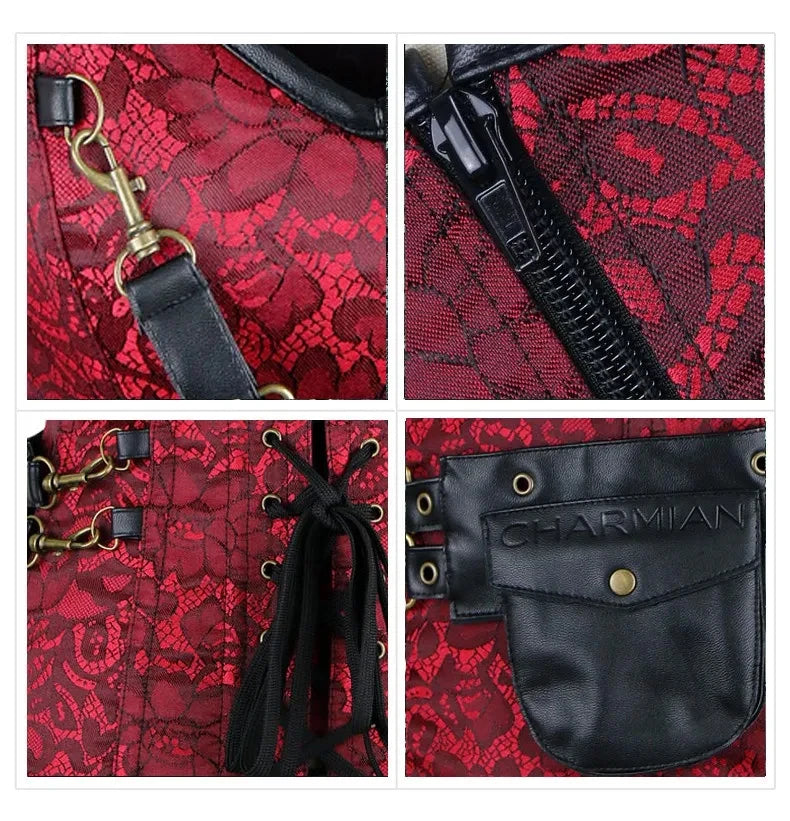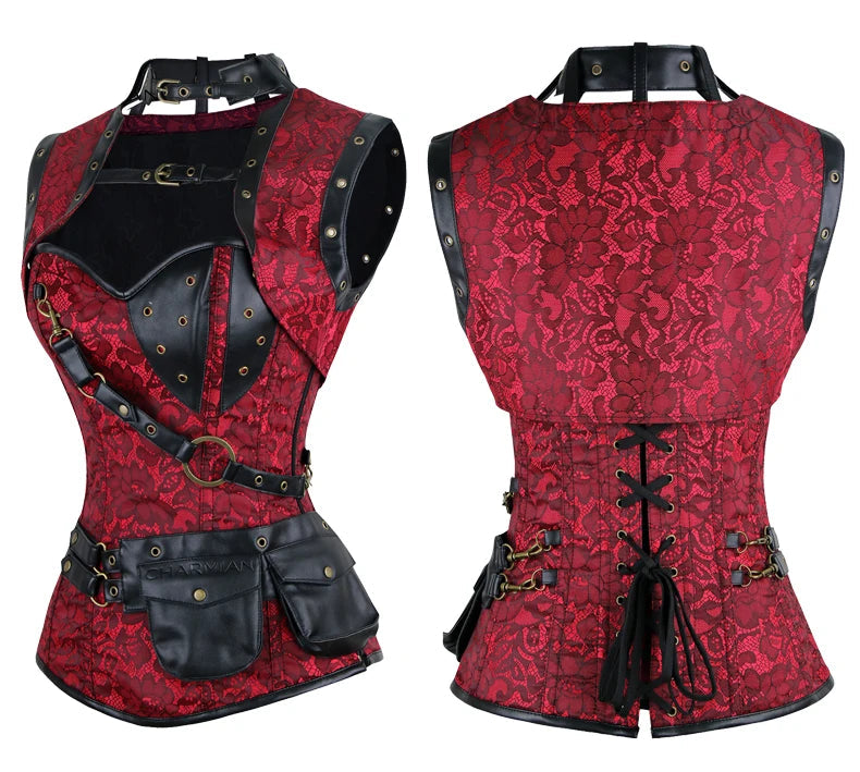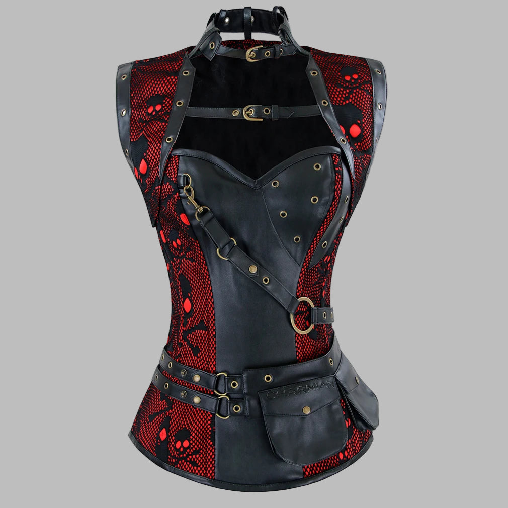 Punk-tyylinen korsetti punaisella verkkokankaalla ja mustilla pääkalloilla