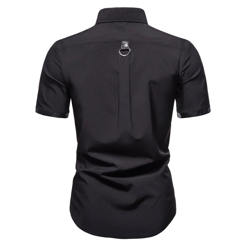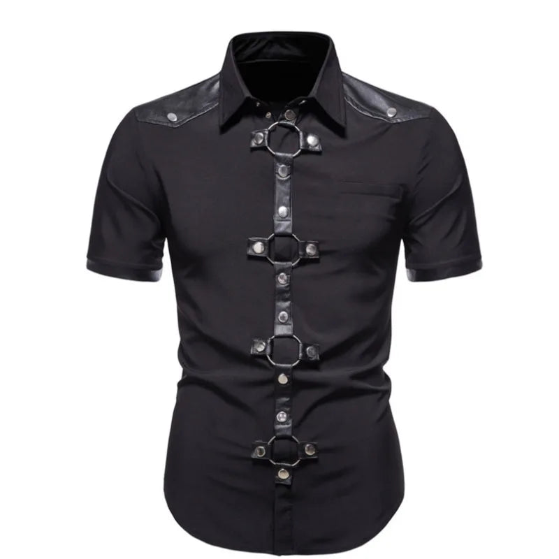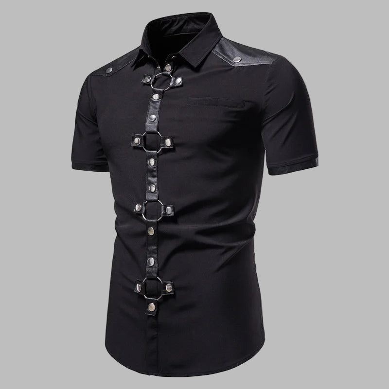 Punk-tyylinen musta lyhythihainen paita metallirenkailla ja remmeillä