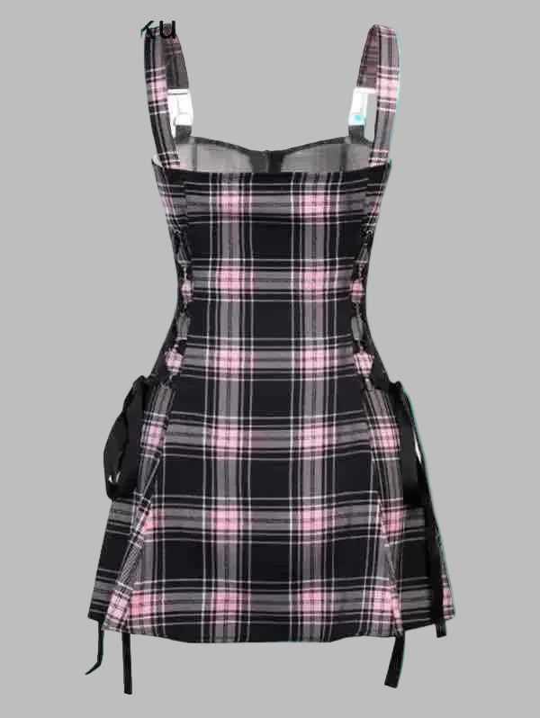 Punk-tyylinen vaaleanpunainen ruudullinen mekko olkaimilla ja nauhoilla Näytä vaihtoehdot