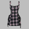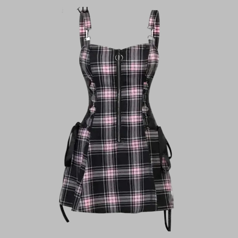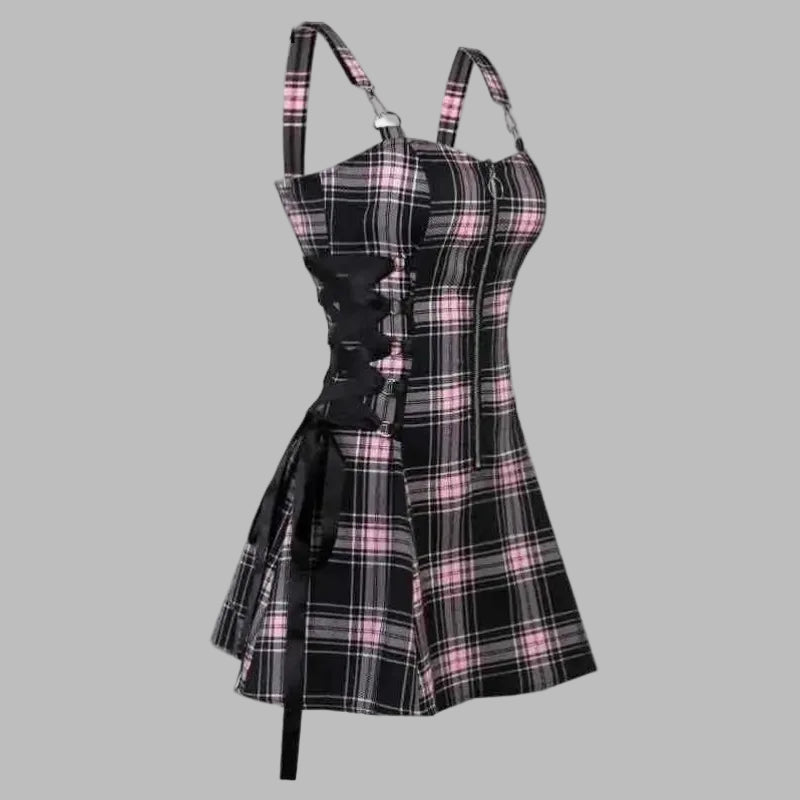 Punk-tyylinen pinkkiruutuinen mekko henkseleillä ja nauhoilla