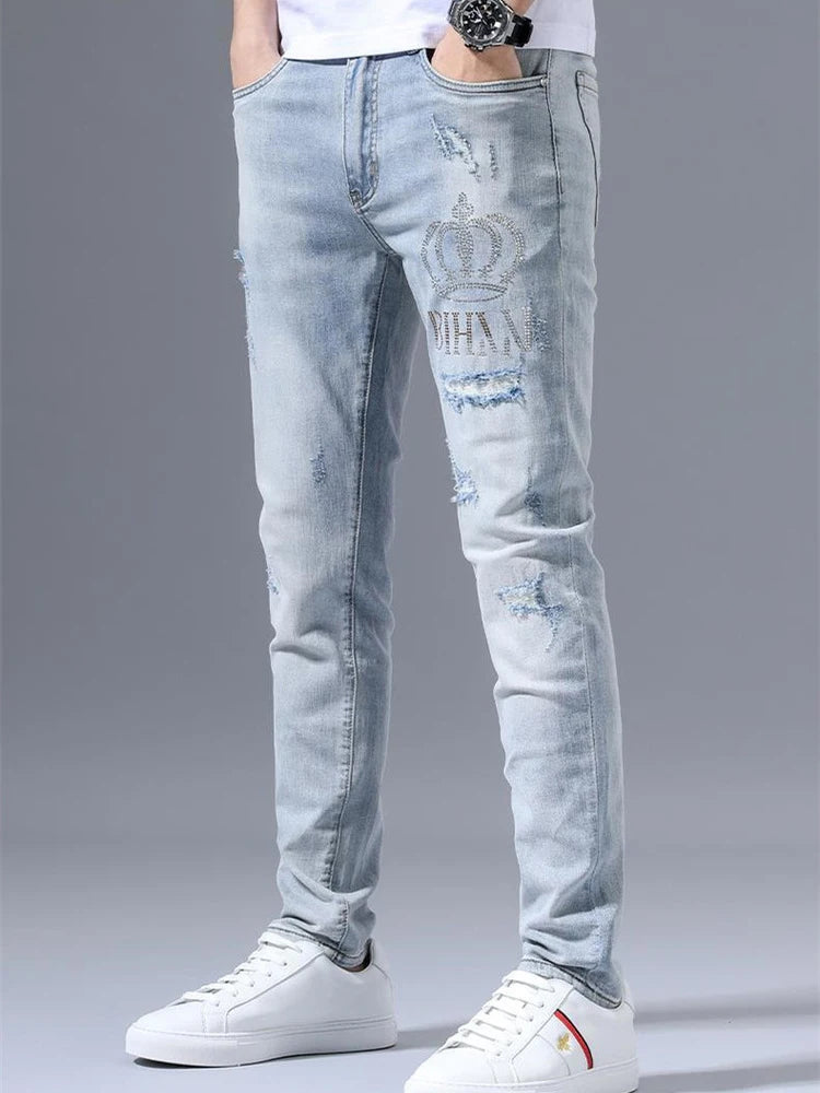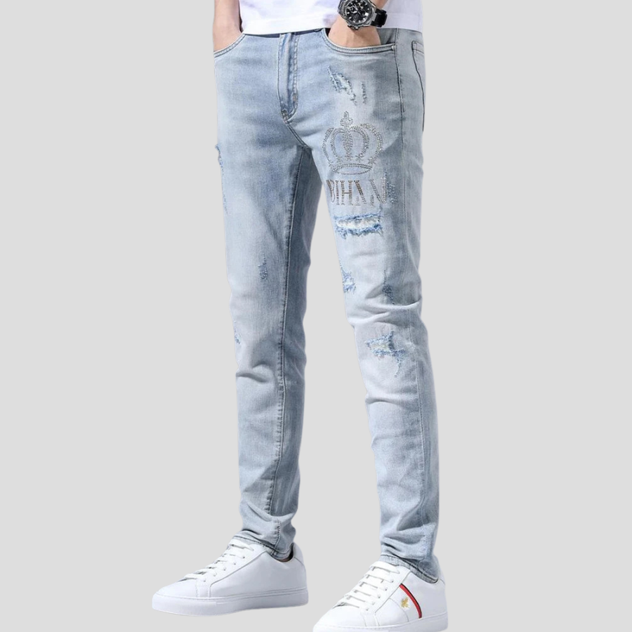 Rock vaaleansiniset revityt farkut kruunukuviolla