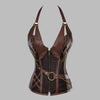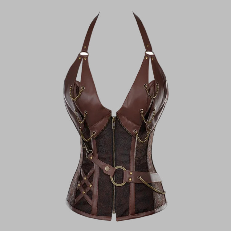 Ruskea steampunk-korsetti ketjuilla ja nahkahihnoilla