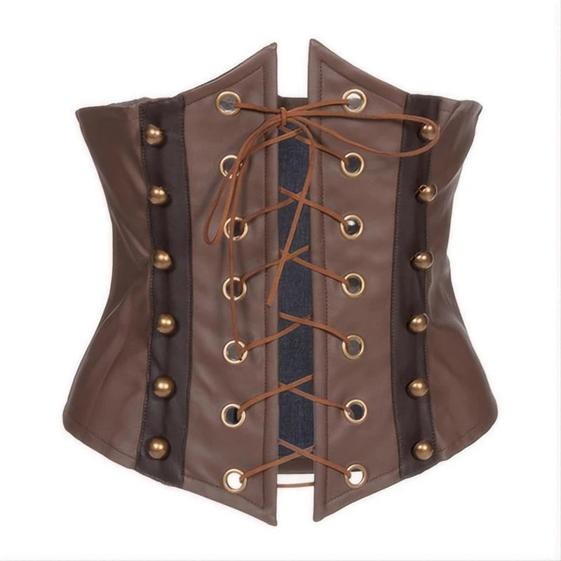 Ruskean Steampunk-tyylinen nahkakorsetti nyörityksellä ja napeilla