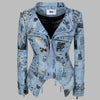 Sininen punk rock -henkinen metallityylinen ramones-takki sanomalehtiprintillä