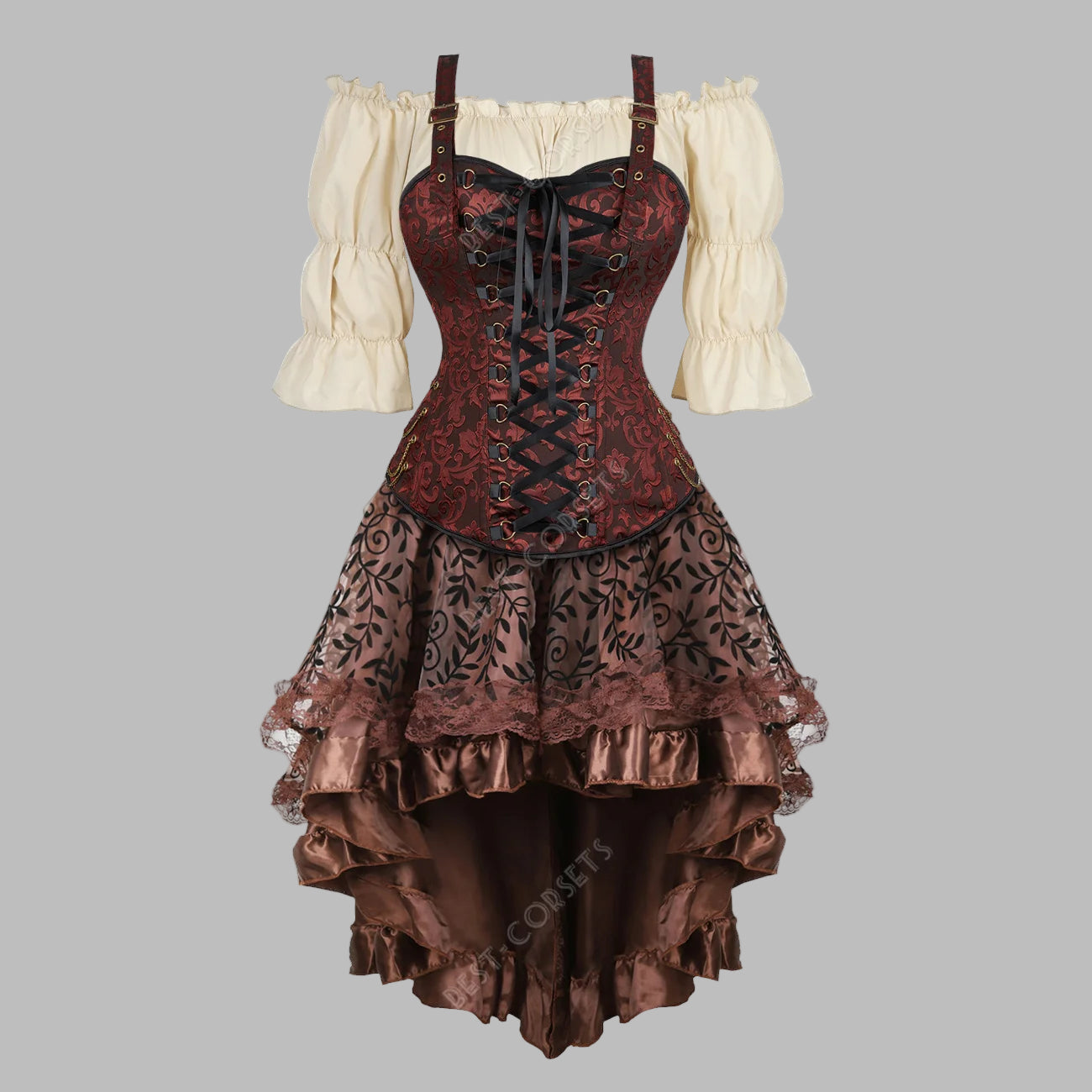 Steampunk-mekko, viininpunainen nyörikorsetti ja pitsiyksityiskohdat
