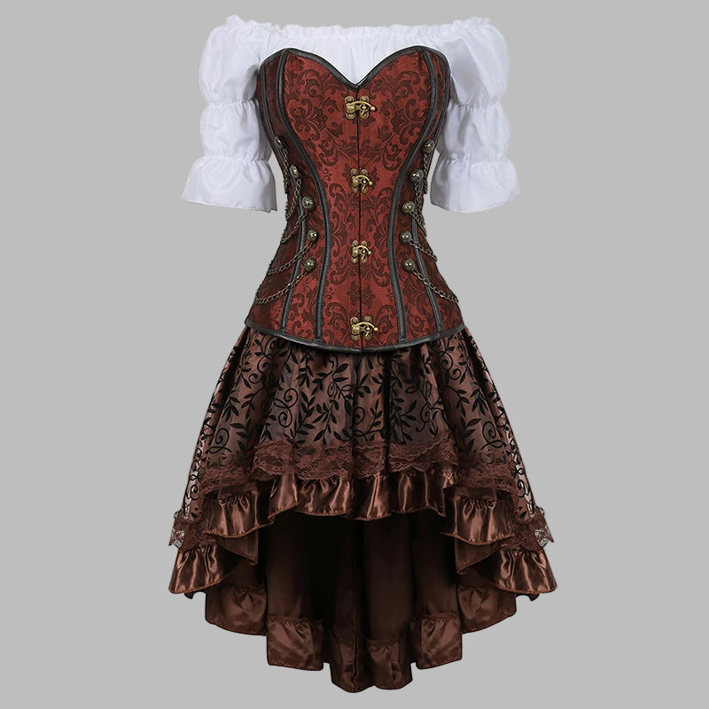 Steampunk-mekko punaisella korsetilla ja röyhelöhelmalla 6XL