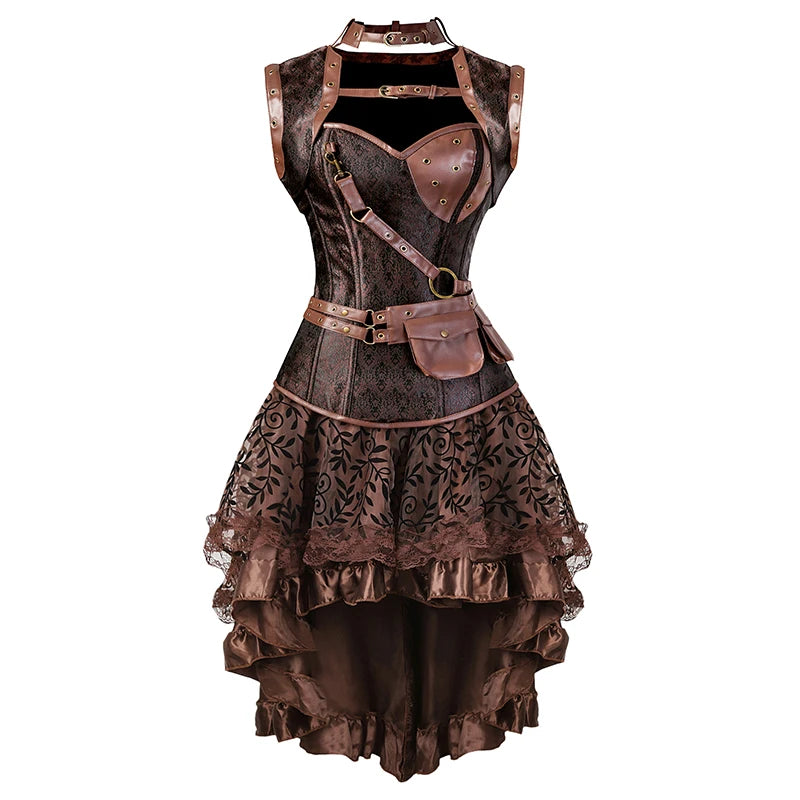 Steampunk-mekko ruskealla korsetilla ja epäsymmetrisellä hameella 6XL