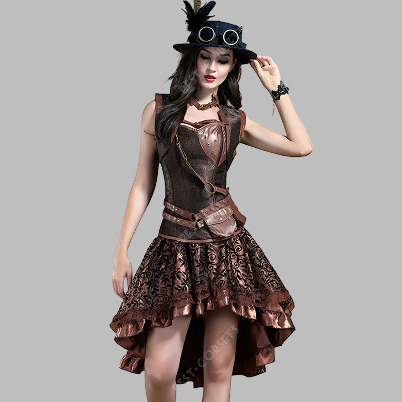 Steampunk-mekko ruskealla korsetilla ja epäsymmetrisellä hameella