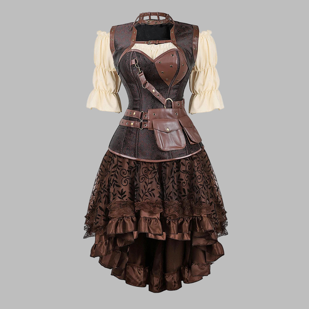 Steampunk-rusettikoristeinen ruskea korsettimekko vöillä ja taskupusseilla