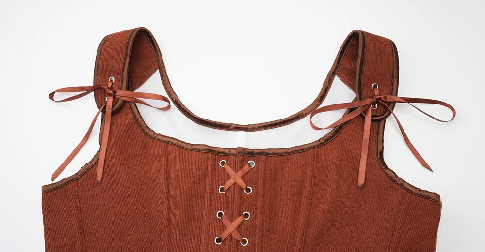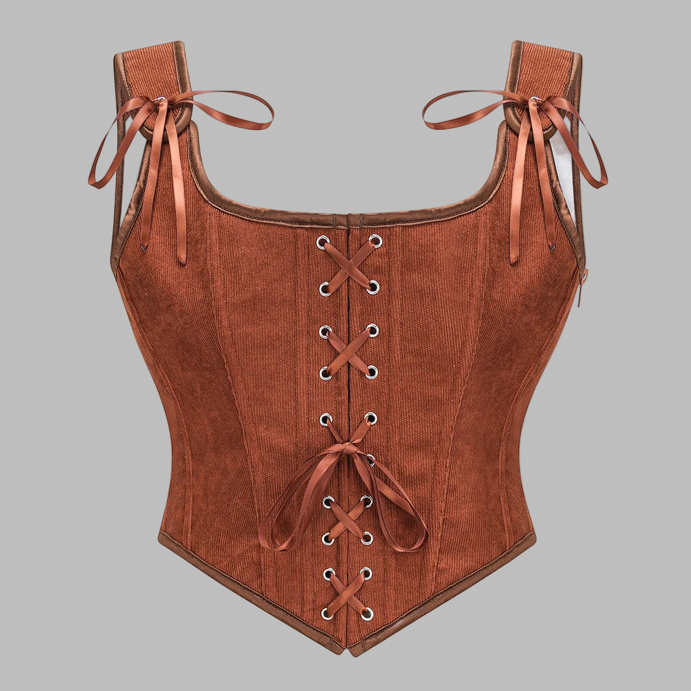 Ruskean Steampunk-tyylinen toppi nyörityksellä ja solmittavilla olkaimilla