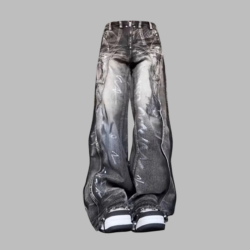 Mustat oversize-grunge-farkut leveillä lahkeilla, unisex, printtikuviot