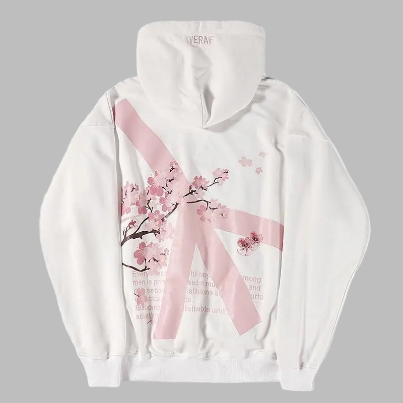 Valkoinen Jirai Kei -huppari vaaleanpunaisilla kirsikankukilla