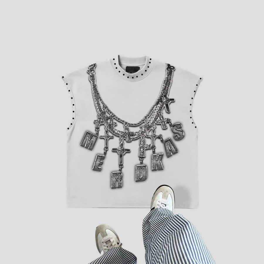 Valkoinen punk‑T-paita ketjugrafiikalla, metallityyli