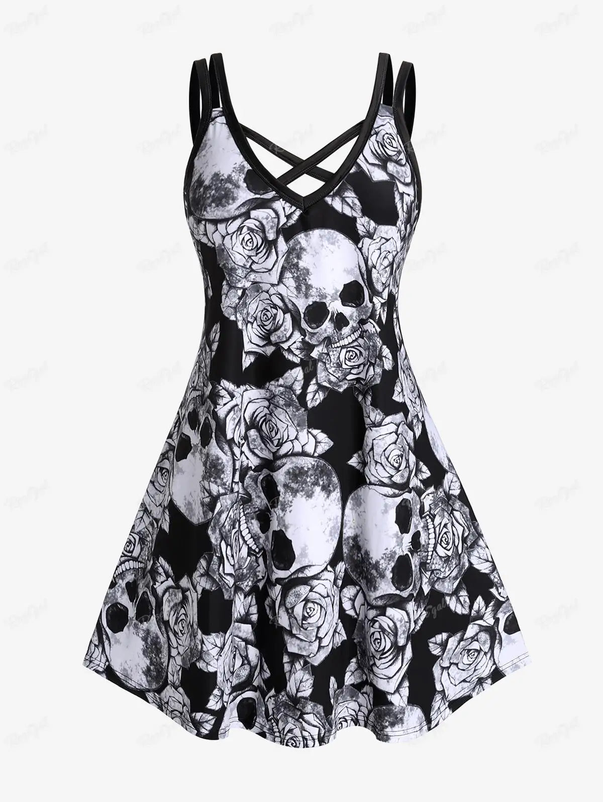 Valkoinen rock-tyylinen mekko, jossa kalloja ja ruusuja, Metal, koko 5XL