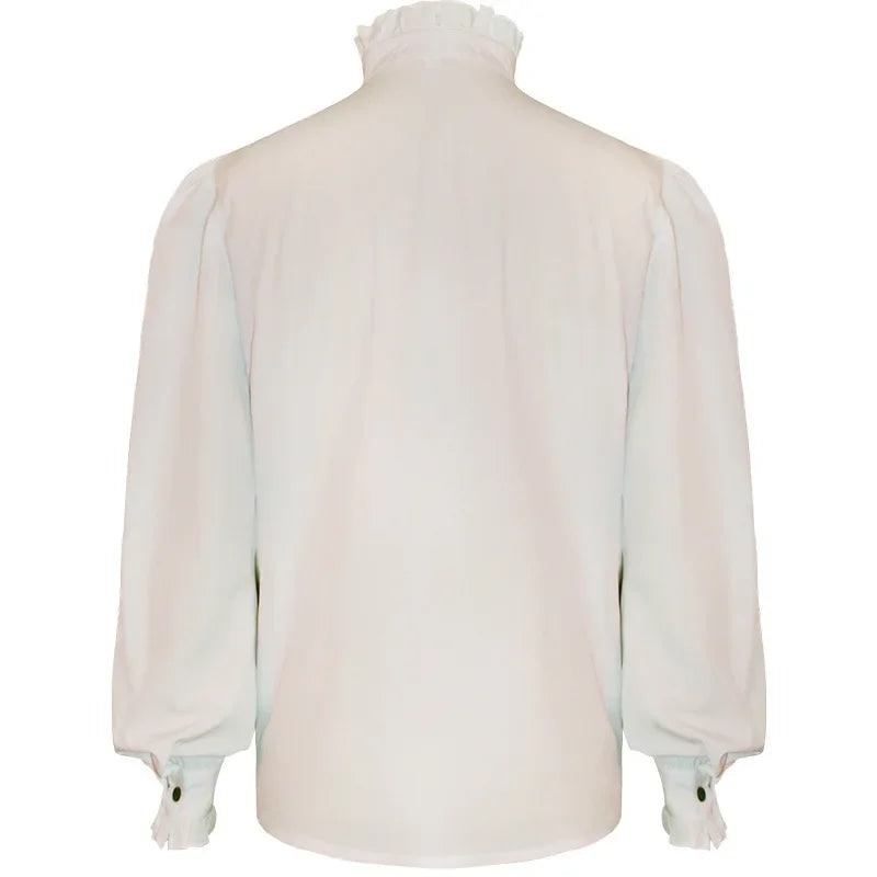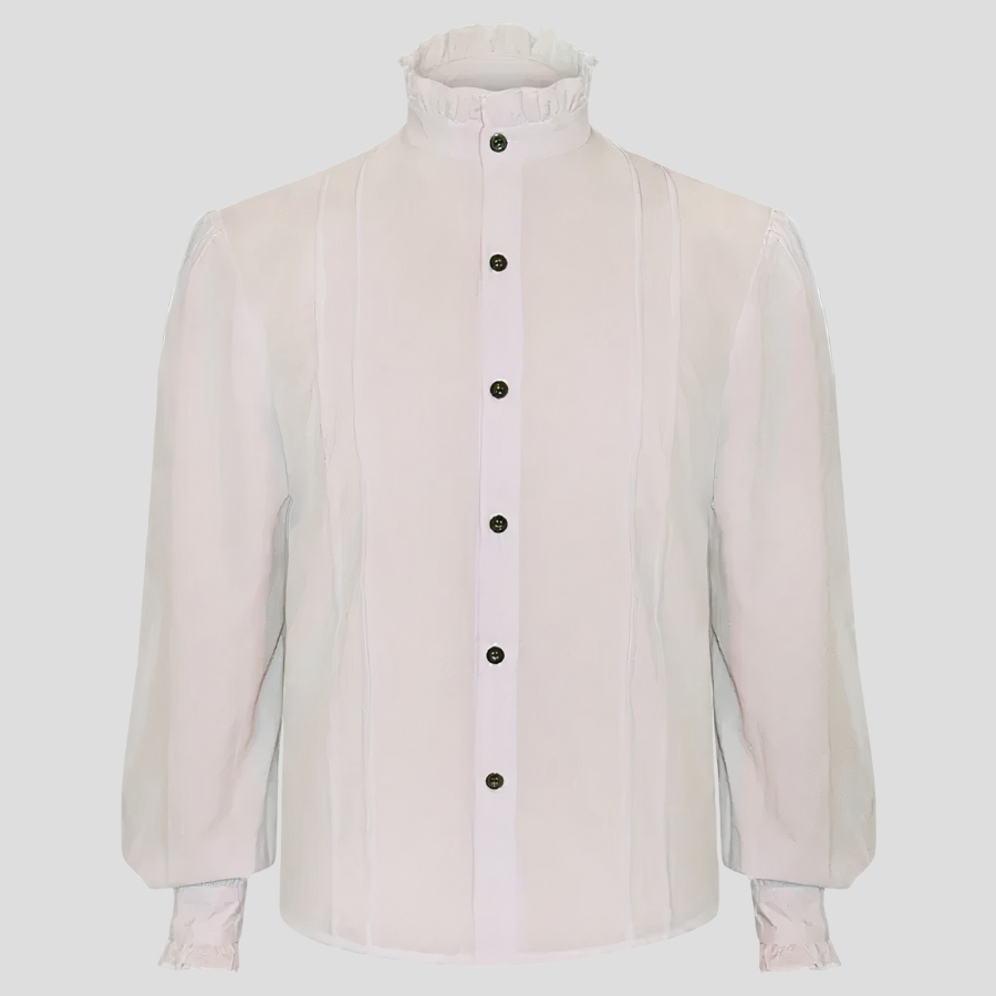 Valkoinen steampunk‑paita korkealla kauluksella, punk-tyyli
