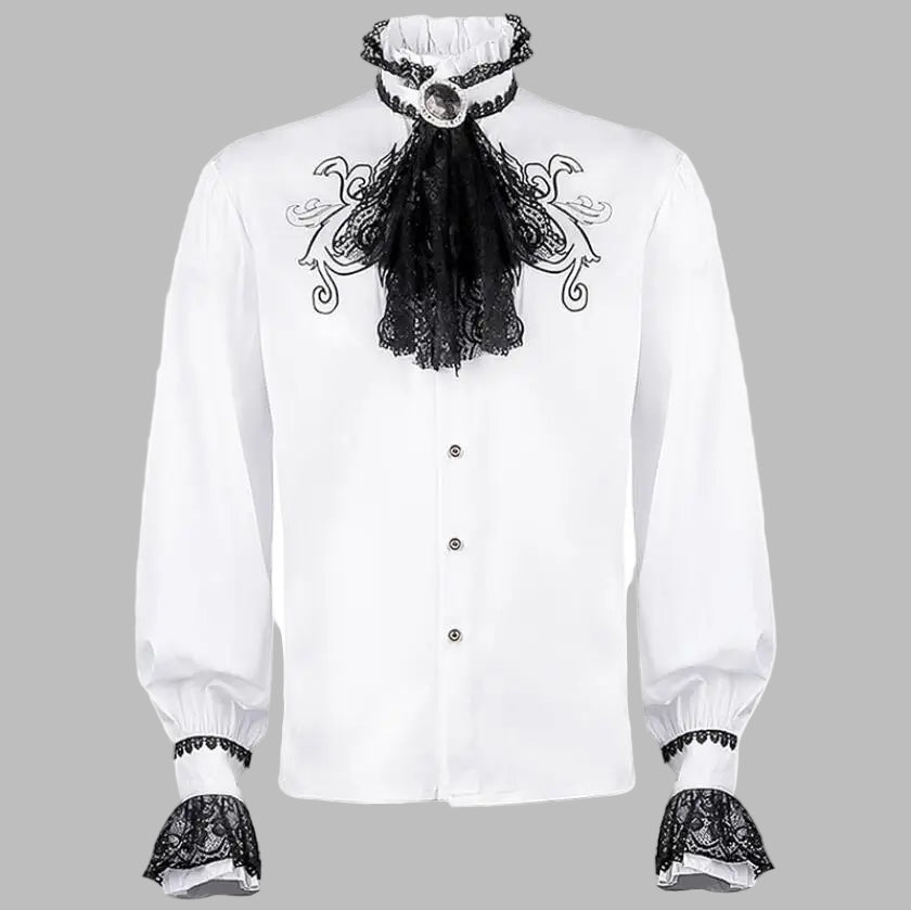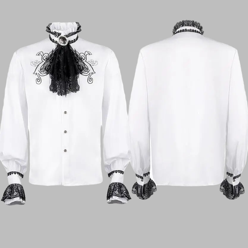 Valkoinen steampunk‑paita pitsiyksityiskohdilla ja jabotilla