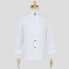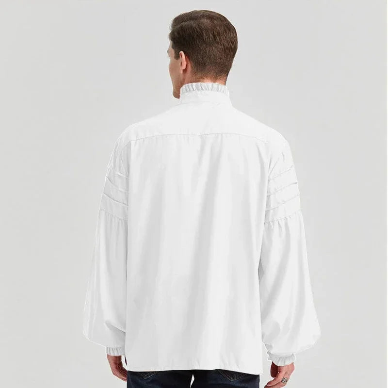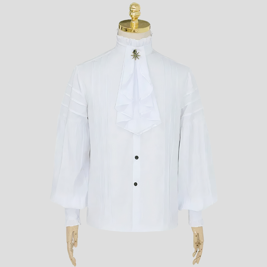 Valkoinen steampunk‑paita röyhelökauluksella ja pussihihoilla