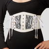 Valkoinen steampunk-pitsikorsetti niiteillä ja nyörityksellä vyötärölle