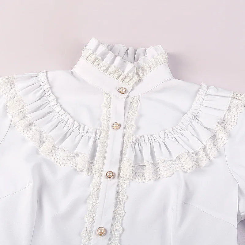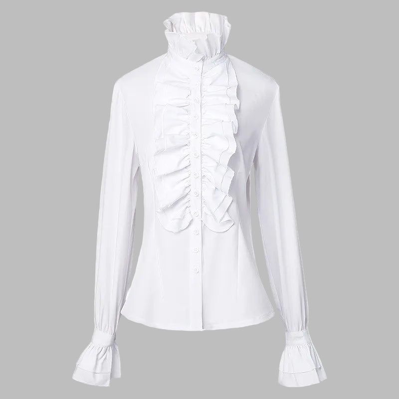 Valkoinen steampunk‑pusero röyhelökauluksella ja pussihihoilla