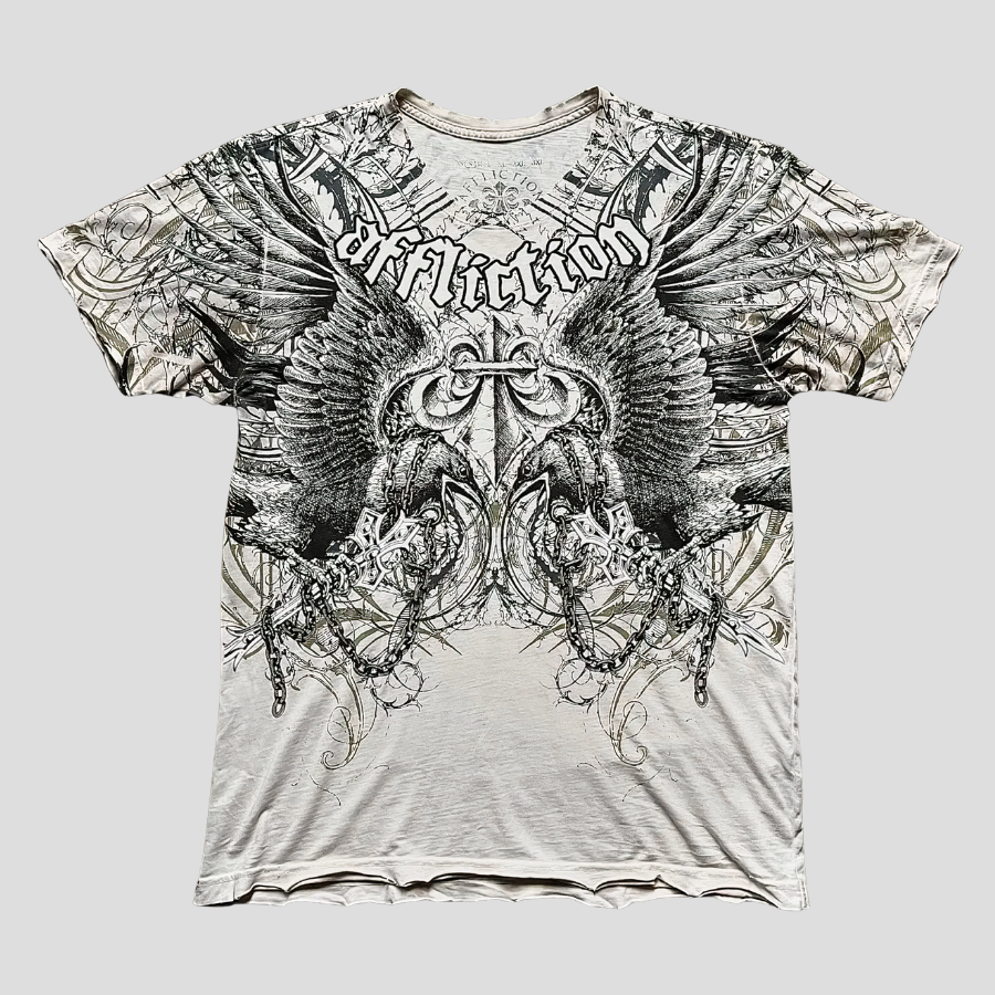 Valkoinen t-paita, jossa goottilaiset siivet ja risti