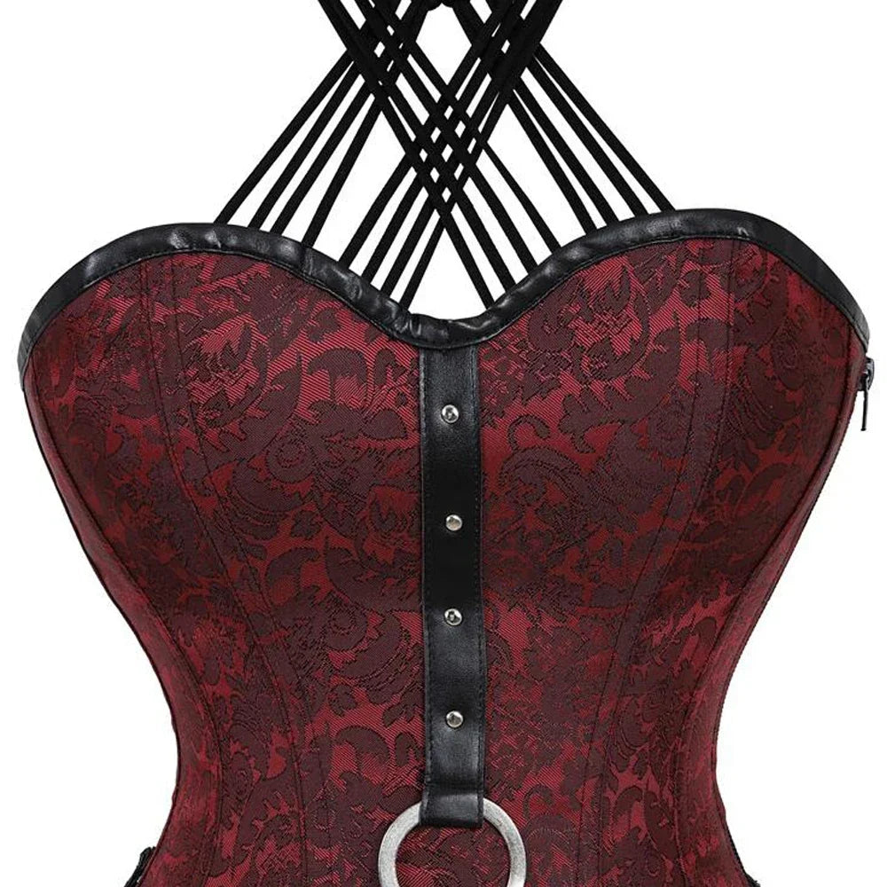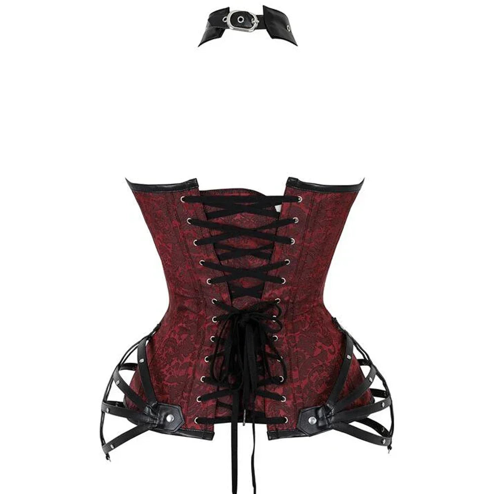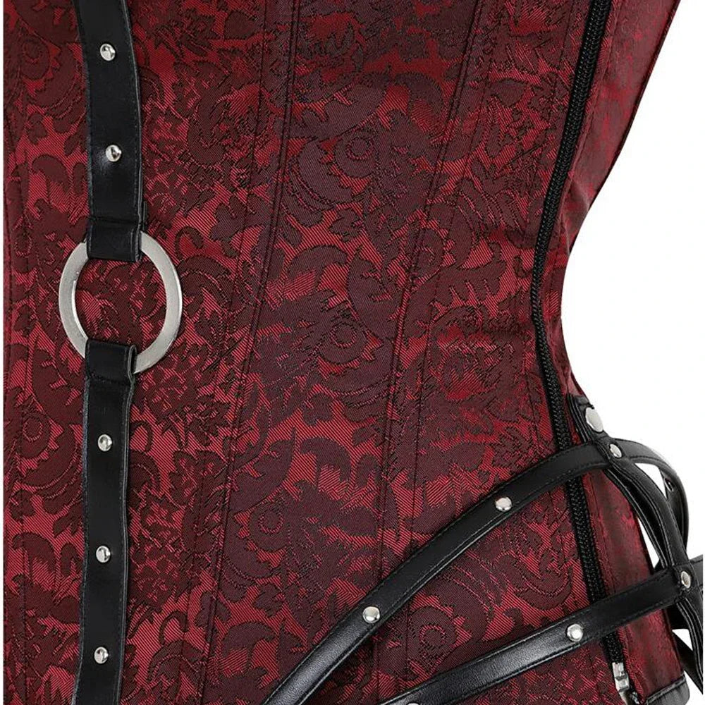 Viininpunainen punk rock -korsetti hihnoilla ja metallisoljilla